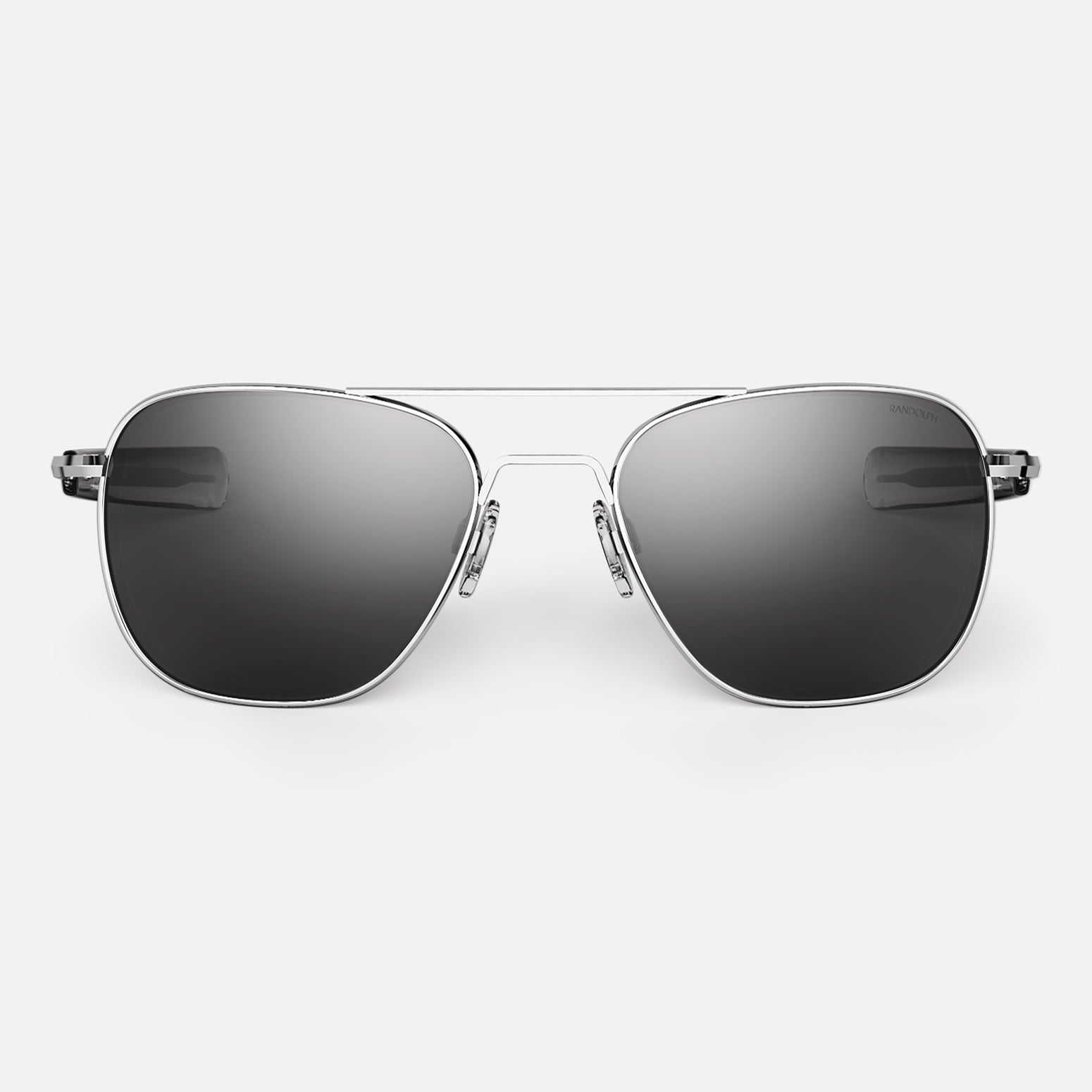 The Aviator, our top-selling icon style, in Bright Chrome with premium American Gray glass lenses. Engineered to military specs, designed and handcrafted in the USA.
